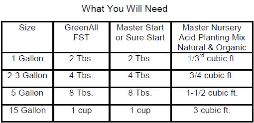 Improve the existing soil from the planting hole with Master Nursery Acid Planting Mix at a ratio of 75% Planting mix to 25% existing soil. To this improved soil, add the appropriate amount of Master Nursery Master Start and Osmocote Slow ReleaseFertilizer, mix thoroughly.