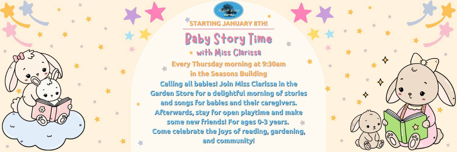 “Join Miss Clarissa in the Garden Store for a delightful morning of stories and songs for babies and their caregivers. Afterwards, stay for open playtime and make some new friends! For ages 0-3 years. Come celebrate the joys of reading, gardening, and community!”