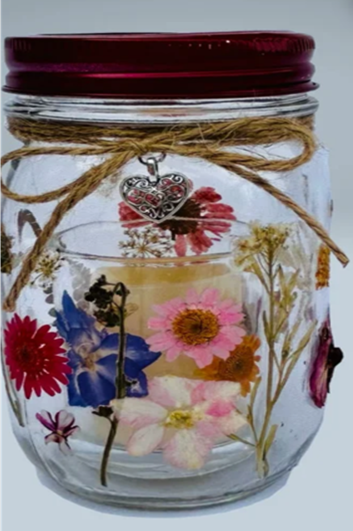 Who doesn’t enjoy a lighted floral display? We will decoupage real beautiful pressed flowers to our jars, adorn them with a tea light, and attach wire hangers for a simple and effective charming lantern.