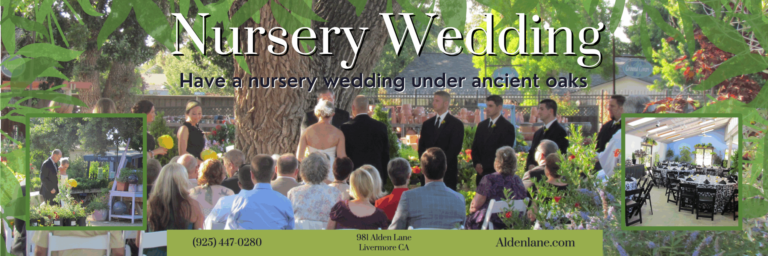 Located on 5 acres and shaded by magnificent valley oaks more than 300 years old, Alden Lane Nursery is a lovely and unique location for an intimate outdoor wedding ceremony. Our more than 3000 trees, shrubs and perennials provide a beautiful natural backdrop for your special day. The nursery is available for wedding ceremonies but not receptions.