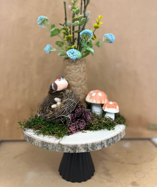 A pedestal filled with Spring Glory! A birds nest and eggs adorned with sprigs of natural twigs and artificial flowers create a natural salute to the Season. And don’t forget the mama bird hovering near her eggs, waiting patiently for them to hatch. A beautiful centerpiece for any spring table.