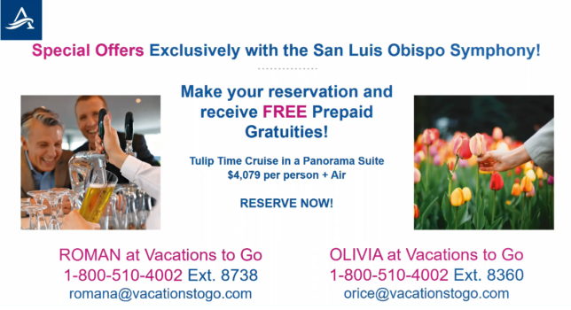 Join the San Luis Obispo Symphony for this springtime river cruise in Holland and Belgium aboard Avalon Waterways. Garden enthusiasts will not want to miss this incredible cruise hosted by Mr. Robert “Bob” Gordon who has arranged a special excursion to see the 2022 Floriade, a once-in-every 10 years International Horticulture Exhibit as well as a visit to see the breathtaking colors of Keukenhof, also known as the “Garden of Europe” and a visit to the World’s Largest Flower Auction in Aalsmeer, Netherlands